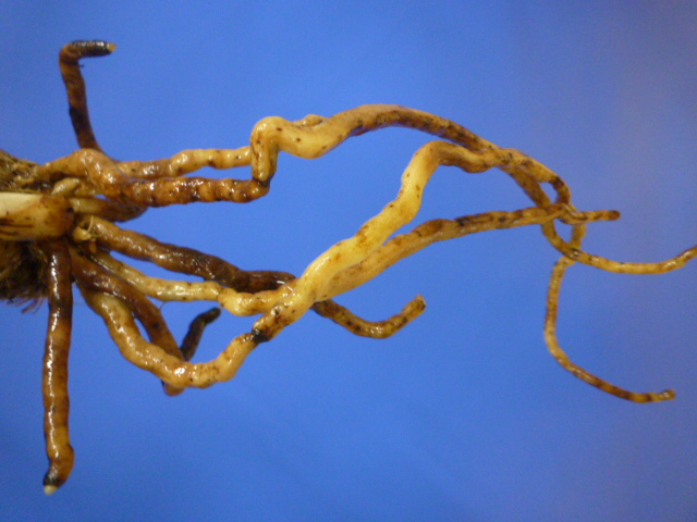 芽出し品で、新芽にも根をおろしています。根が茶色いですが硬くしっかりしていますので、じっくり育ててあげてください。舌の大きな魅力的な花は、展示会でも大変人気です!