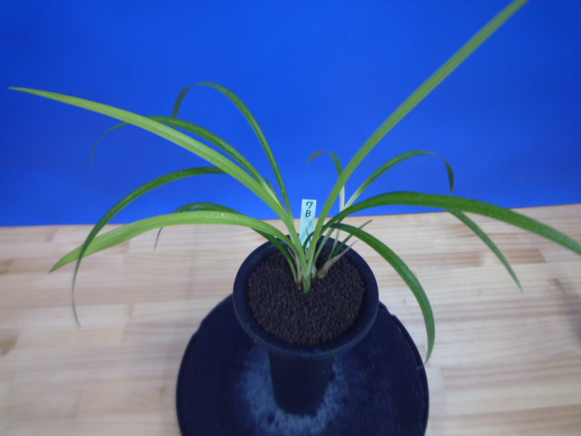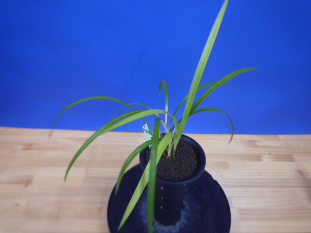 荒城の月は、高知県産の紺覆輪で花も黄色紺覆輪の大きなベタ舌系です。花軸の伸びが良く、花間をとるバランスの良い花です。展示会でも良く金賞を獲る品種で、葉芸品ながら作り易い所も魅力です。新芽は紺覆輪で上がり、後にも残りますので花がない時期でも楽しめます。