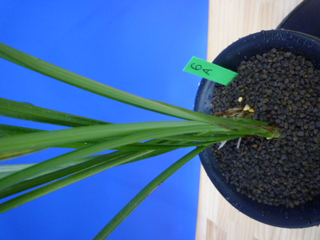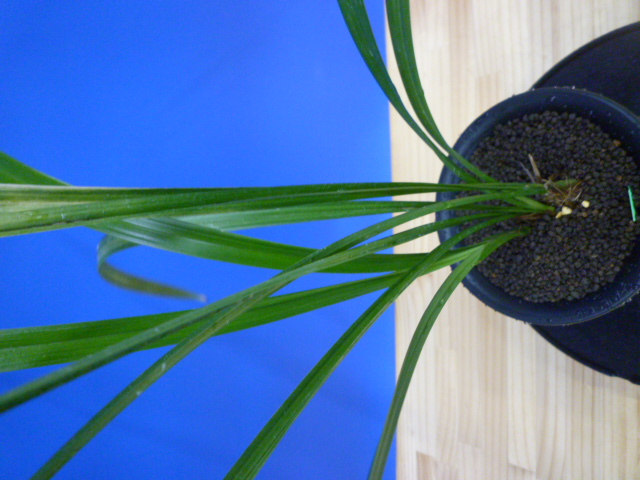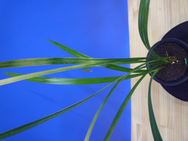 水月は、高知県産の大輪一文字咲きの素心です。昭和55年に土佐愛蘭会に登録されています。花軸の伸びが良く、花間も良好です。