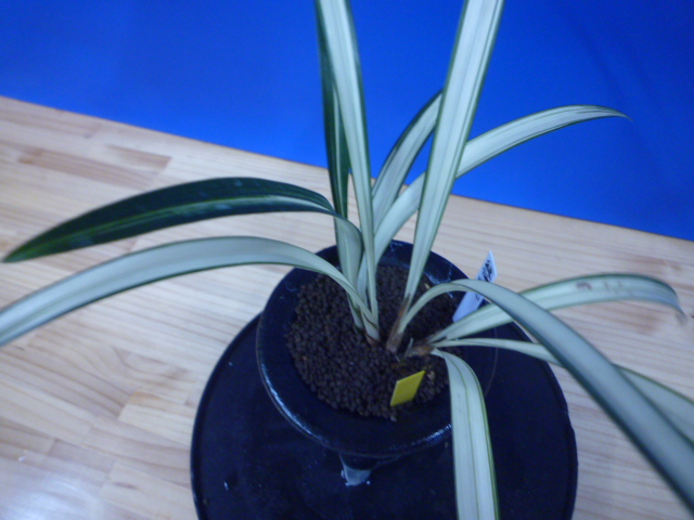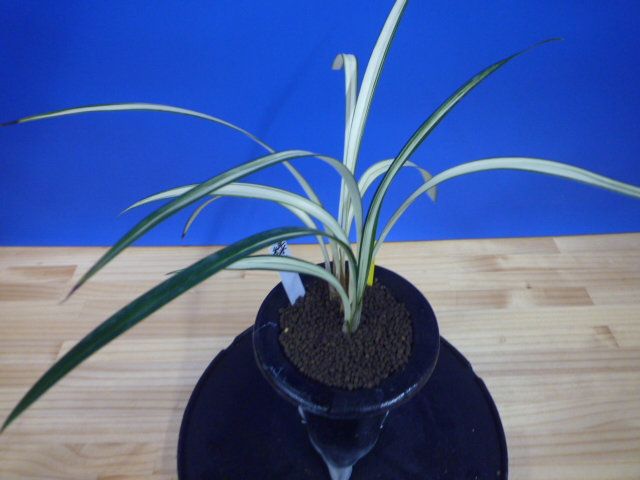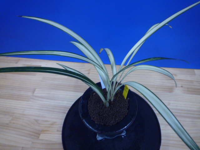 緑宝は、高知県産の紺覆輪純白中斑芸の葉芸品で、昔から大変人気の高い一品です。作り易く、初めての方にもおすすめです。展示会ではよく金賞を獲る品種ですので、柄良し、花良しの名品です。柄の変化が多彩で、良い柄を出す楽しみがある王道の柄物です。
