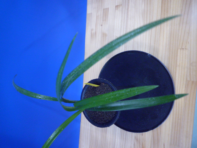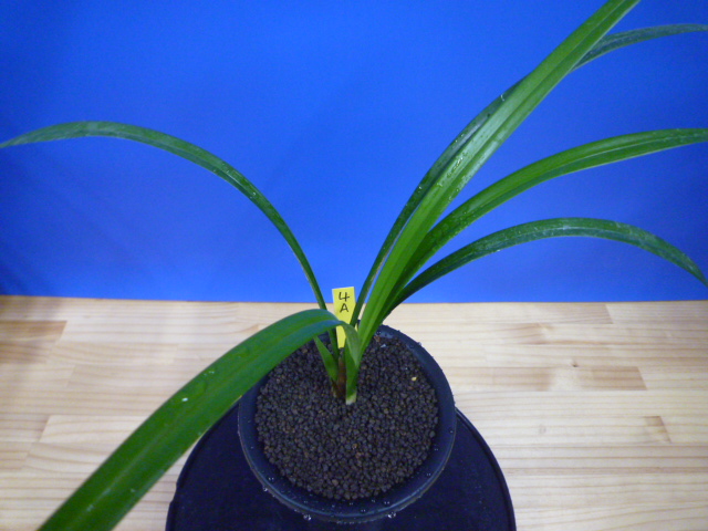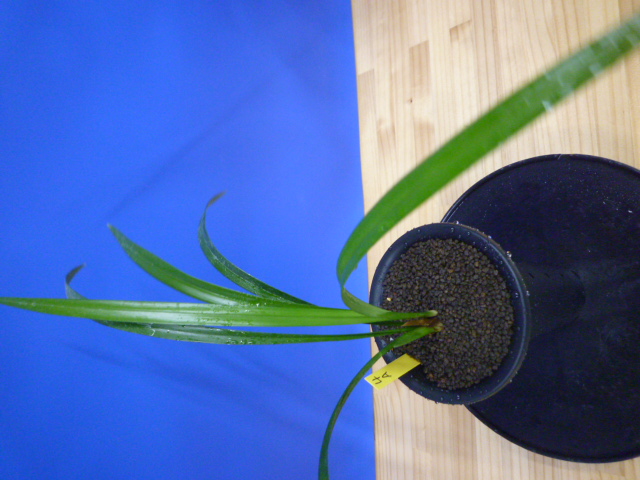 色変わり系の黄花無点系です。金鵄系の黄花ですので、大変色がきれいで発色も良くきれいな色で咲きました。画像の花は初花で宮崎の平野部で咲かせてこの色で咲きました。初花以来何度か花を咲かせてきましたが、画像のような花で咲いたり、柄花のように咲いたりと多彩な花色の変化があり、そこに魅力を感じました。花色の安定化も大事ですが、こういった特殊な色合いの花は、咲くタイミング、環境の変化で違った表情を見せてくれますので、長く楽しめます。花は大きくはありませんが、花形がよく、舌が無点系で清楚で気品があり見事です。